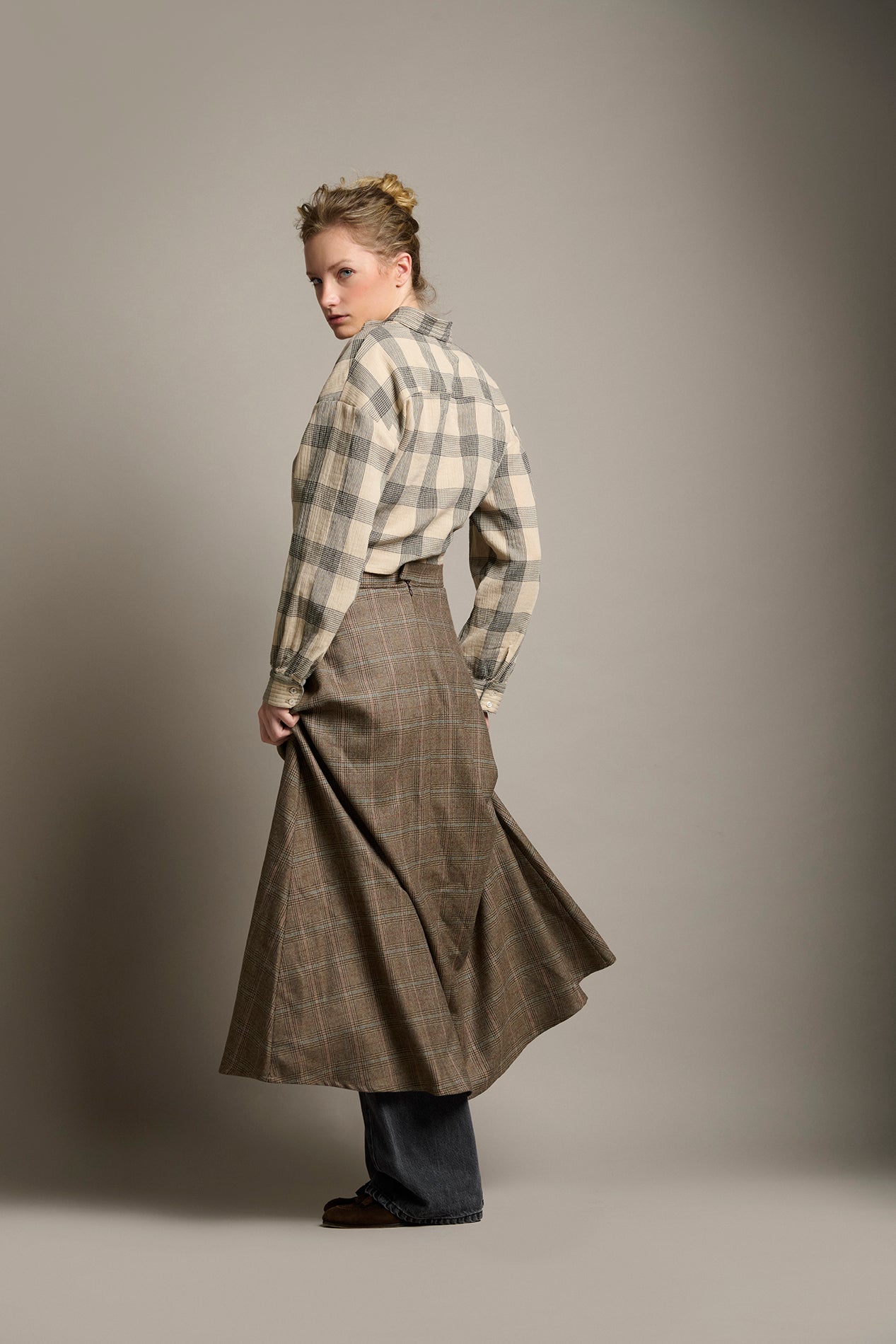En esta temporada se confeccionó en tejido Príncipe de Gales, un gran aliado para nuestros closets por su patrón neutro y sofisticado, que permite infinitas combinaciones: desde camisas y blusas lisas hasta sweaters, cardigans o blazers, tanto en looks formales como en propuestas más relajadas.