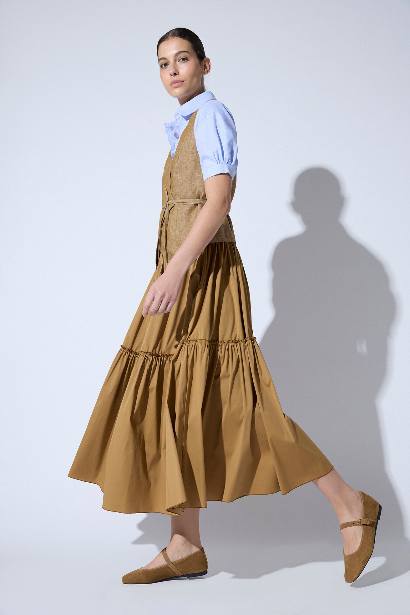 El frente se cruza y se ajusta con tiras delgadas del mismo lino, que pueden anudarse hacia adelante o atrás, adaptándose al estilo de quien lo lleva.