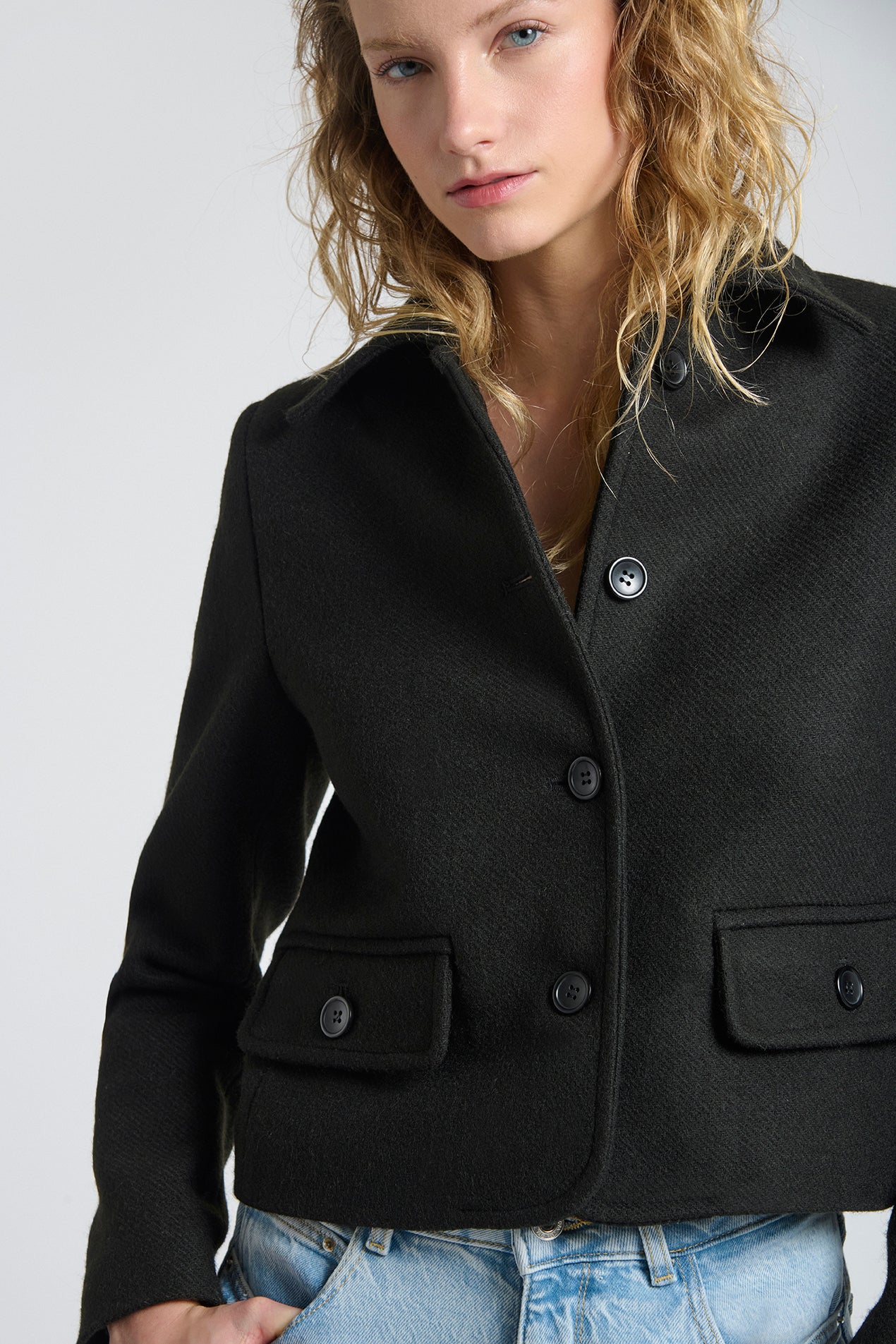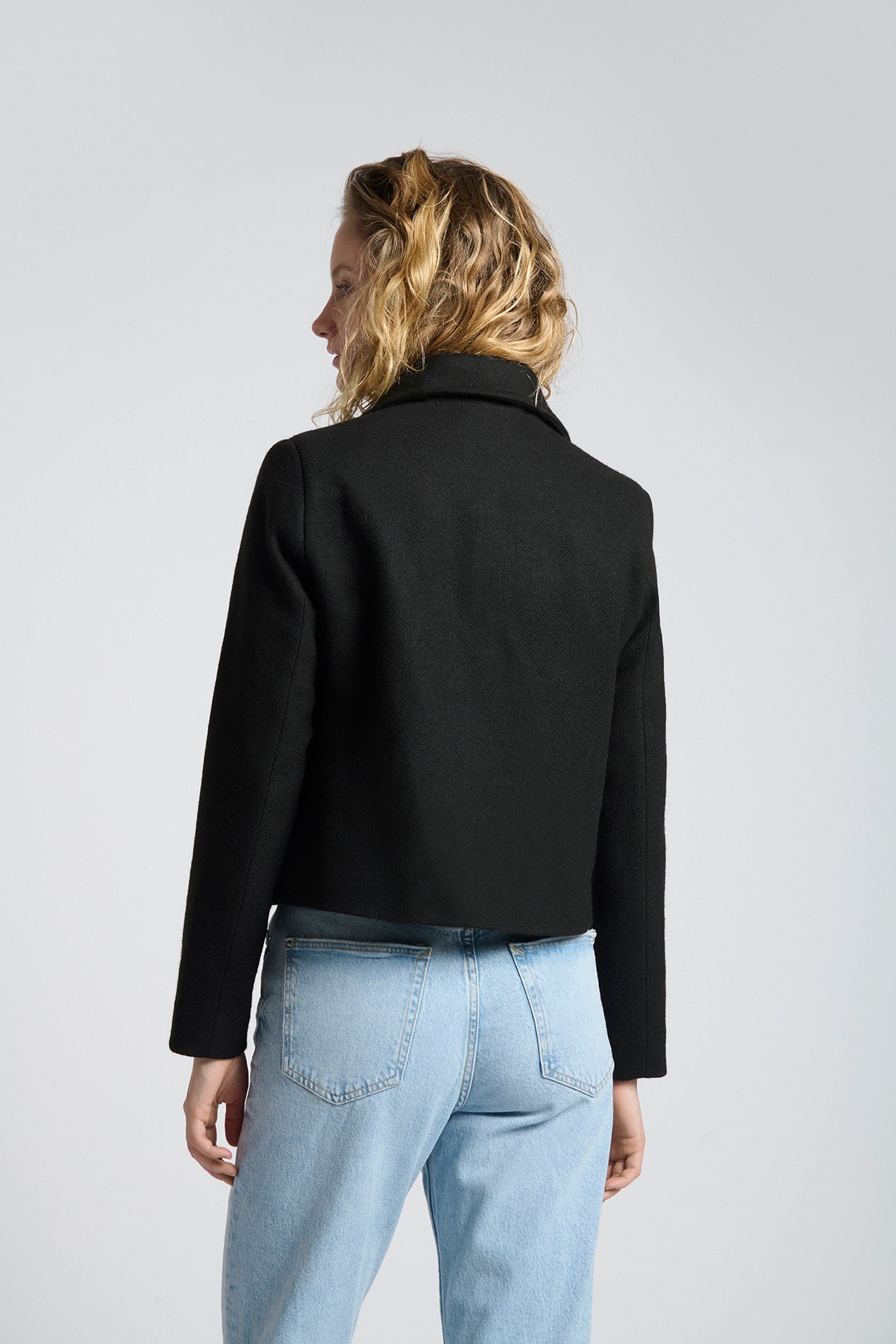 Berna , es nuestra nueva chaqueta corta confeccionada 100% de lana. Su diseño estructurado se destaca por un cuello clásico de mayor tamaño, imponente y elegante.