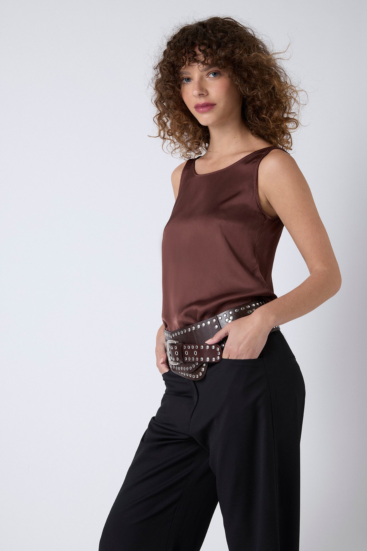 Kala es un top sin mangas de diseño minimalista con escote redondo, el cual en la espalda es más rebajado. Confeccionado en suave viscosa de alta calidad, tiene caída ligera y un tacto fresco que lo convierte en la opción perfecta tanto para el día a día como para looks más elegantes.