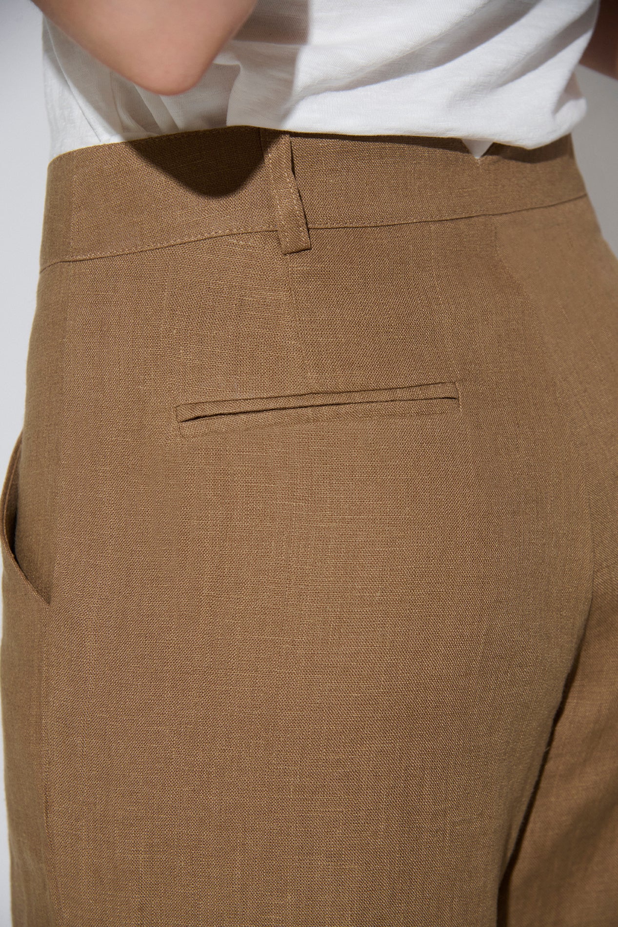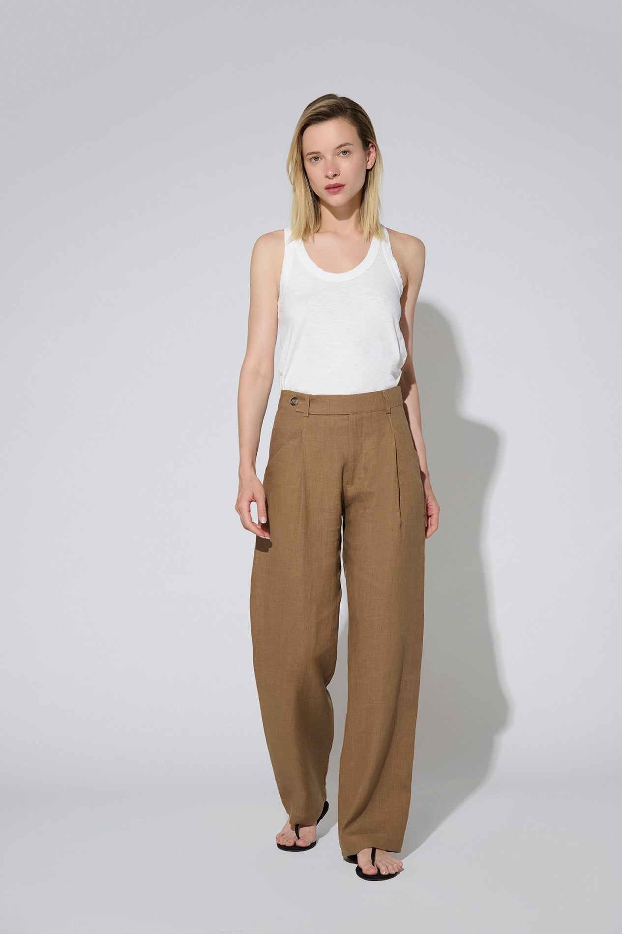 Pantalón largo confeccionado en lino. Su estructura incorpora pliegues frontales marcados, que no solo aportan elegancia, sino que también ofrecen mayor amplitud y comodidad en la zona de la cadera.