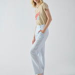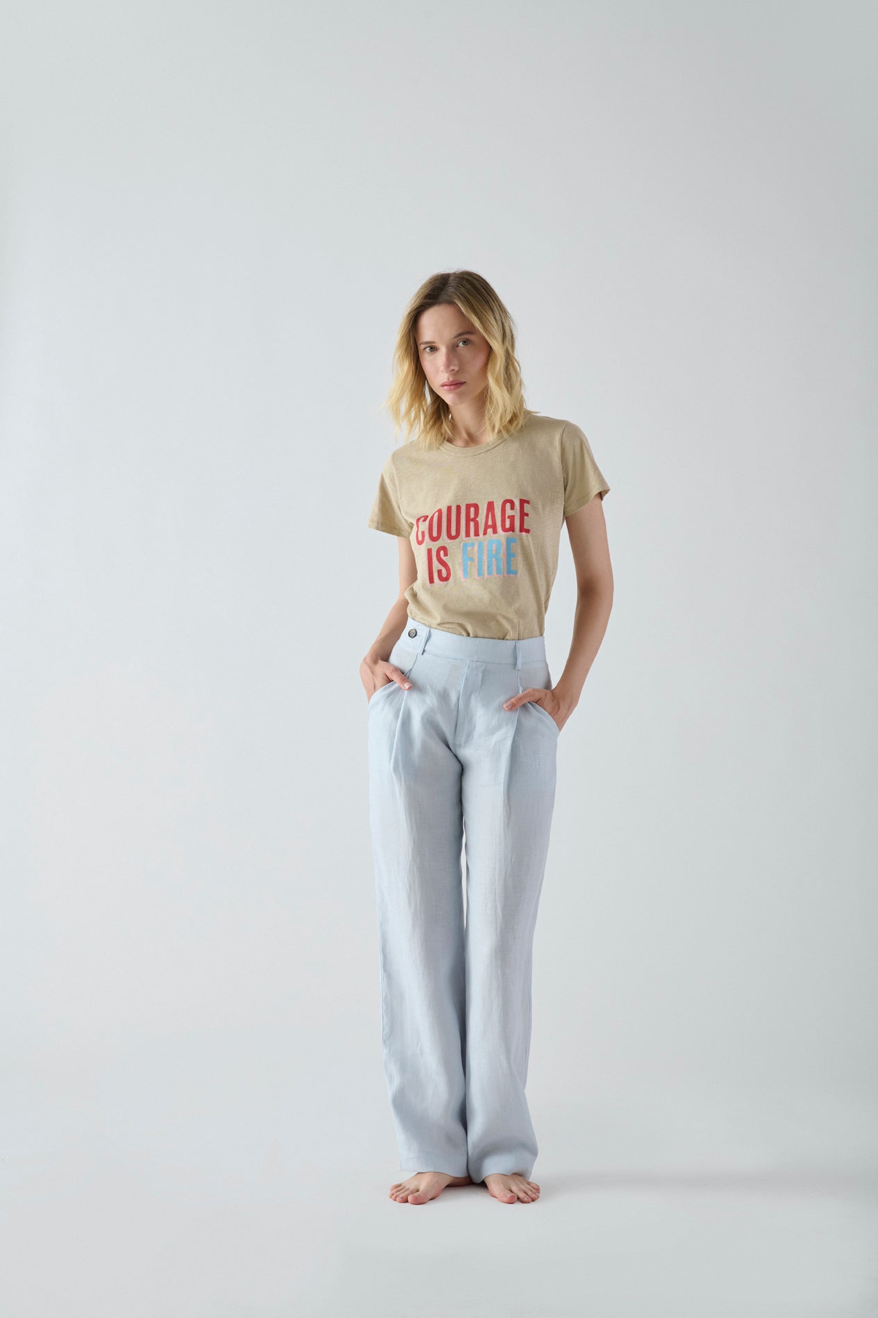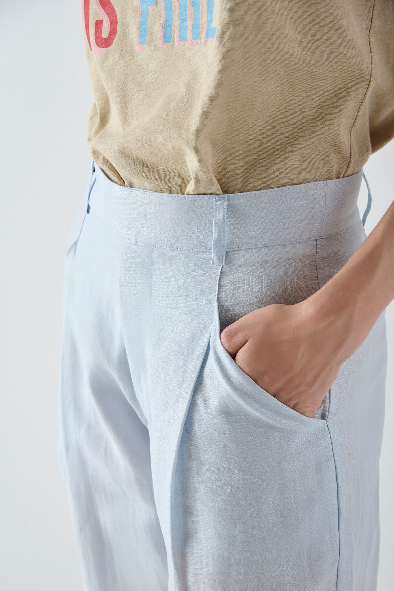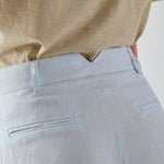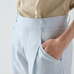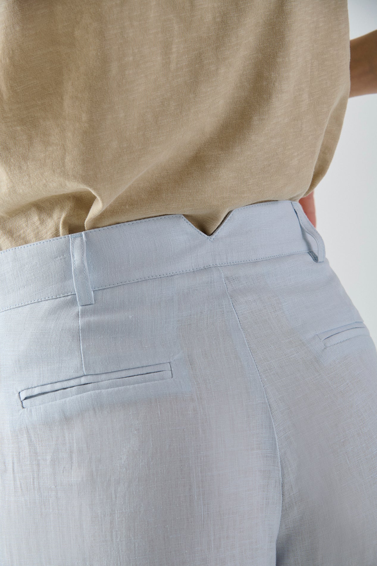 Pantalón largo confeccionado en lino. Su estructura incorpora pliegues frontales marcados, que no solo aportan elegancia, sino que también ofrecen mayor amplitud y comodidad en la zona de la cadera.